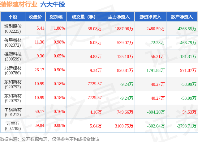证券之星动静,4月2日,沪指报收3919。29,较前一买卖日下跌0。74%。拆建筑材行业全体表示一般,较前一买卖日下跌0。74%,6只个股上涨,29只个股下跌。个股表示方面,拆建筑材行业当日领涨股为濮耐股份(002225),该股当日报收5。41,上涨1。88%,成交量38。08万,从力资金净流入1887。96万元。伟星新材(002372)以上涨0。98%紧随其后,该股当日成交量6。05万,从力资金净流入539。07万元。雄塑科技(300599)、北新建材(000786)、东和新材(920792)均进入当日牛股之列。具体个股列表见下表: